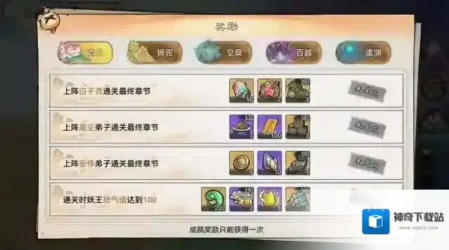 当然,为了更好的引导祖师们游玩,四方平妖玩法设置了通关阶段奖励和成就目标奖励,祖师完成任务后别忘了领取奖励哟~