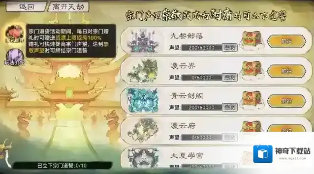 宗门道誓是任务目标类型玩法,祖师需要获得邻近宗门的道誓才可通关此劫。
