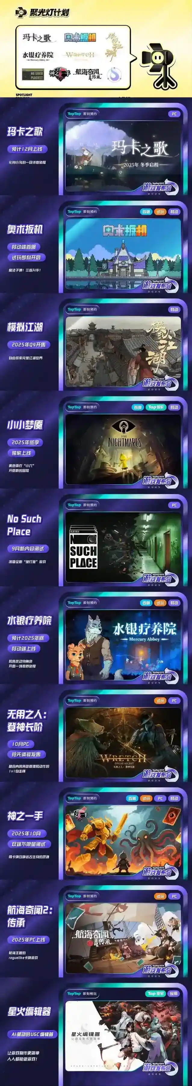 本次发布会依然保留了为优质独立游戏免费曝光的“聚光灯计划”版块,这也是“聚光灯计划2.0”升级后的发布会首秀,经过公开的报名招募,共 8款移动和PC游戏入选:
