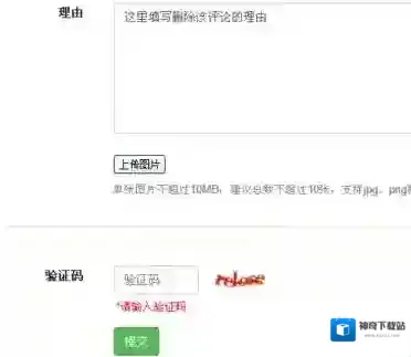 7、然后在“理由”中填写申请删除该评论的原因,填写完成后可以选择上传图片证明,最后输入验证码点击提交;