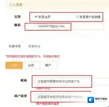 6、打开“诚信举报投诉”就进入了诚信举报投诉页面,在“个人信息”处选择自己的身份,然后填写接收投诉信息结果的邮箱,到下边的“我要举报”栏目下填写第四步中的昵称以及商户地址;