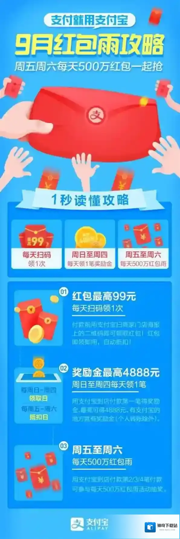 在9月的每个周五周六到店付款的第2、3、4笔付款可以参与每天500万红包雨活动抽奖,单笔付款金额需超过两元。