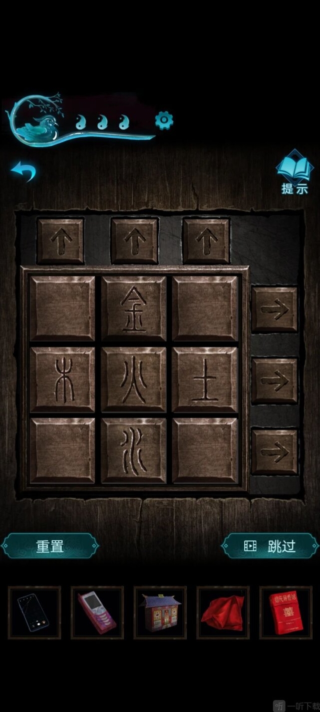 回到祭坛,上山,要爬几次才能上去,把图贴在二十四节气的图上,得出答案,解开下方滑块,得到招魂令,放到祭坛上。