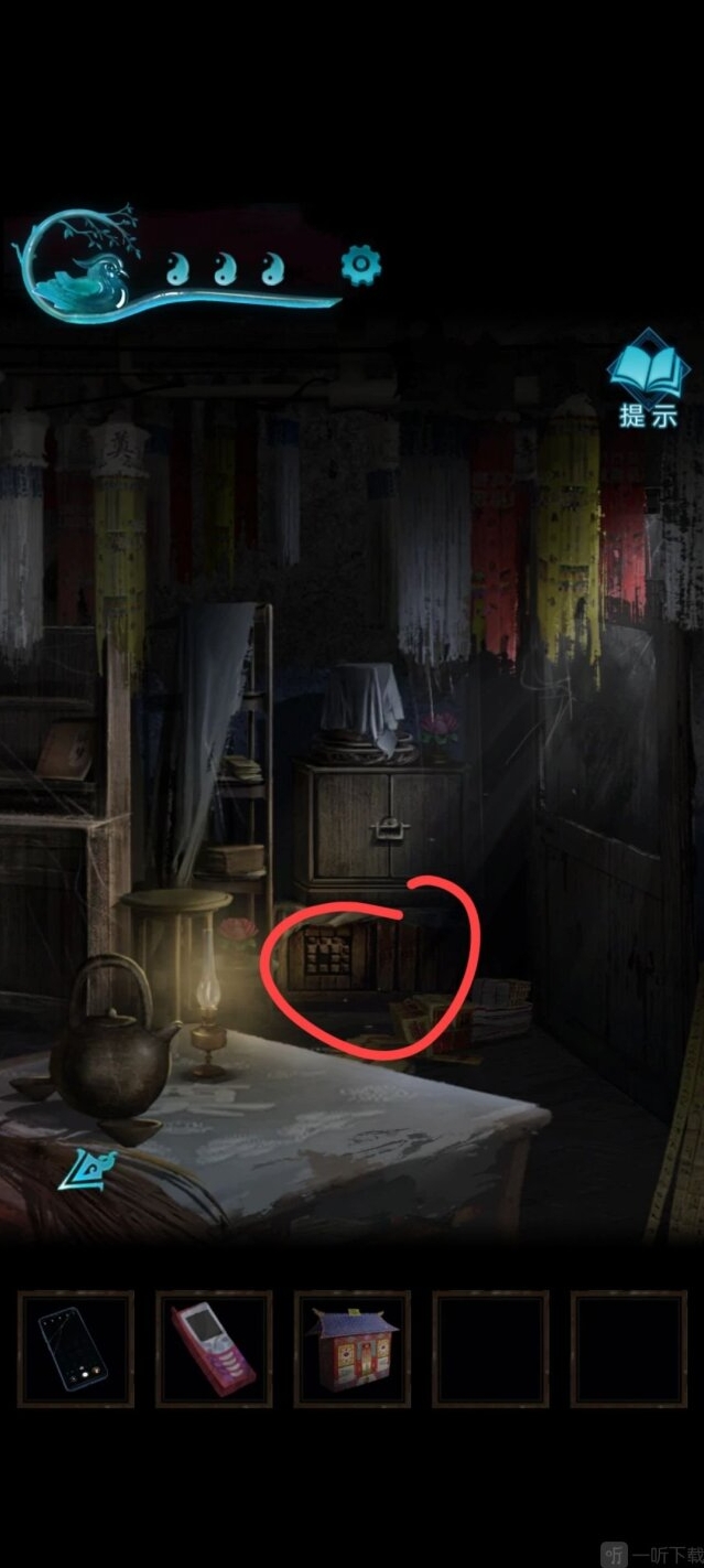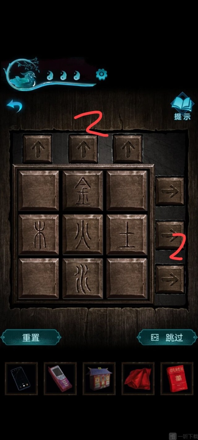 别走上面和尚送的盒子,把划片划到对应的位置得到小图腾旗,回客厅插在小车上,开动风扇撞倒扫把,就可以进去了。