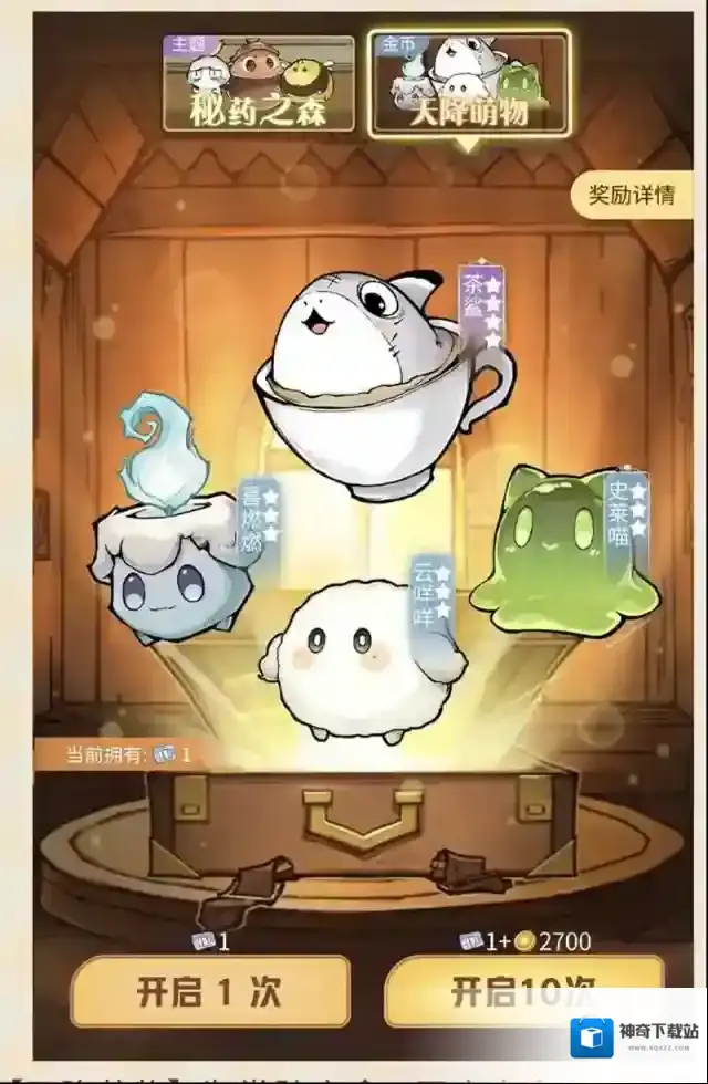 玩家们可通过开启盲盒获取不同萌宠,其中“天降萌物”为常驻盲盒,开启后有概率获得三星或四星萌宠,主题盲盒会不定期更新各种主题萌宠,开启后会有概率获取限定主题的四星萌宠。