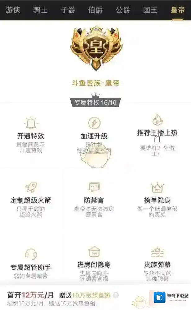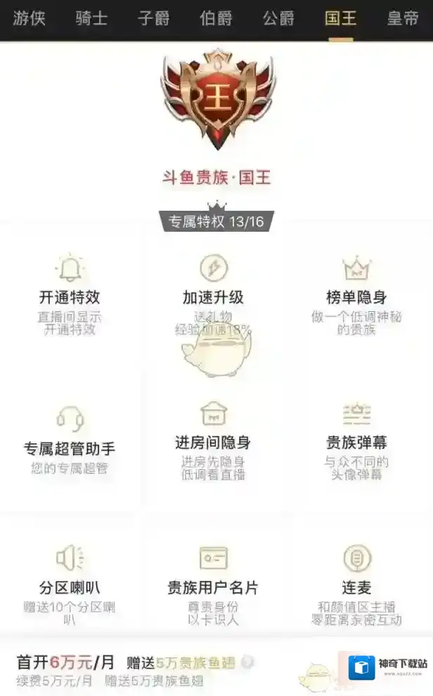 专属特权:开通特效、加速升级16%、进房间隐身、贵族弹幕、分区喇叭5个、贵族用户名片、连麦、贵族礼物、贵族勋章、进场欢迎、开通续费通知。