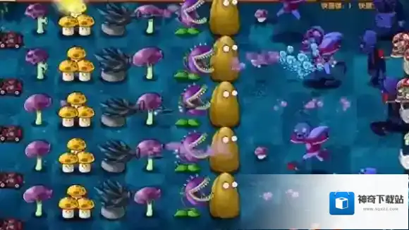 3、在里侧补齐一列胆小菇和一列阳光菇,在二路种植两个阳光土豆雷。
