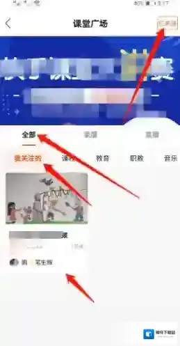 4、在课堂广场中可以看到有看看,我的关注,全部课程等;