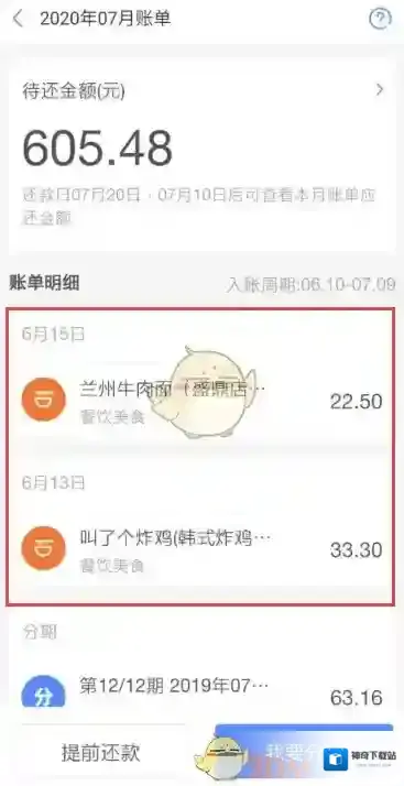 3、可以看到自己的饿了么账单,点击“提前还款”即可给吃货卡专享额度还款。