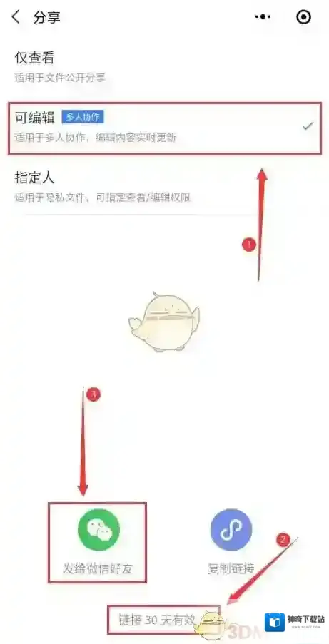 11、在“分享”页面,先设置好权限(如:可编辑)和有效天数,之后点击“发给微信好友”(或复制)即可分享出去,实现多人协作编辑该文档。见下图
