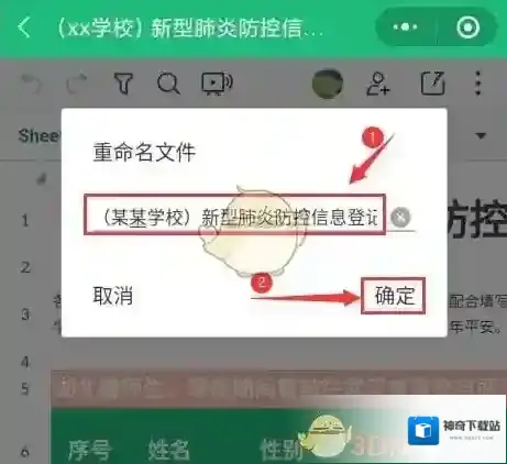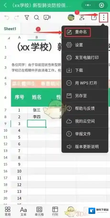 6、进入表格页面,如需要修改就先修改,之后点击右上角三个小点,接着在弹出的下拉菜单中,点击“重命名”。见下图