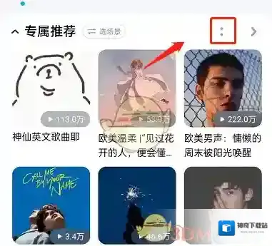 1、打开酷狗音乐,在首页,找到一个卡片,点击两个点。
