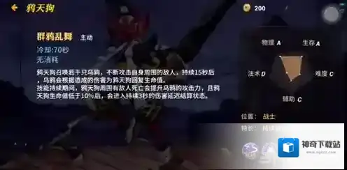 鸦天狗召唤若干只乌鸦,不断攻击自身周围的敌人,持续15秒后,乌鸦会根据造成的伤害为鸦天狗回复生命值。技能持续期间,鸦天狗周围有敌人死亡会提升鸦天狗的攻击力,且鸦天狗生命值低于10%后,会进入持续3秒的延迟结算状态。