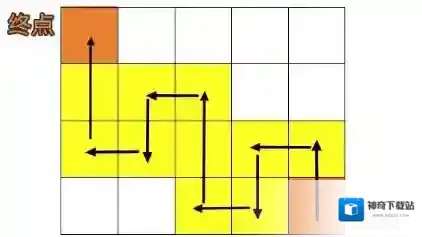 9、具体步骤:往上一格,往左一格,往下一格,往左一格,往上两格,往左一格,往下一格,往左一格,往上两格,成功到达终点;