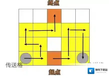12、具体步骤:往右一格,往上两格,往右一格,往下两格,传送到另一个区块;往右一格,往上一格,往左一格,往上一格,往右两格,往上一格,成功到达终点;