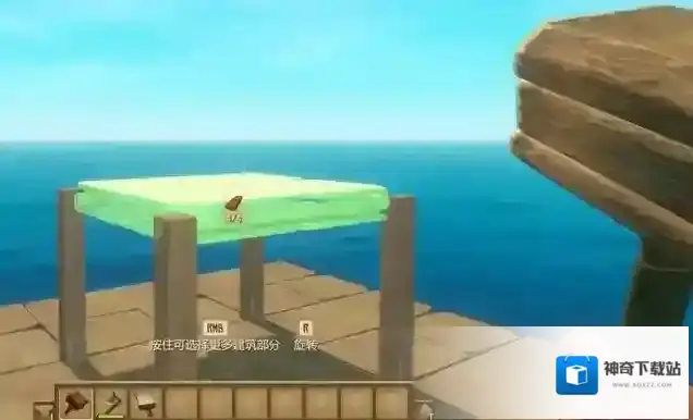 第二步:手持建造木锤,按鼠标右键不松手调出建筑面板,选择木头柱子(右键不能松手哈)然后在木筏上先建造木头柱子