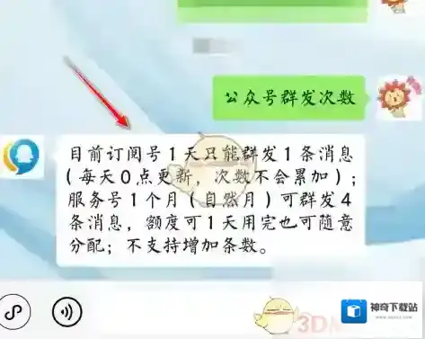 6、咨询客服得知:目前订阅号1天只能群发1条消息(每天0点更新,次数不会累加);服务号1个月(自然月)可群发4条消息,额度可1天用完也可随意分配;不支持增加条数。
