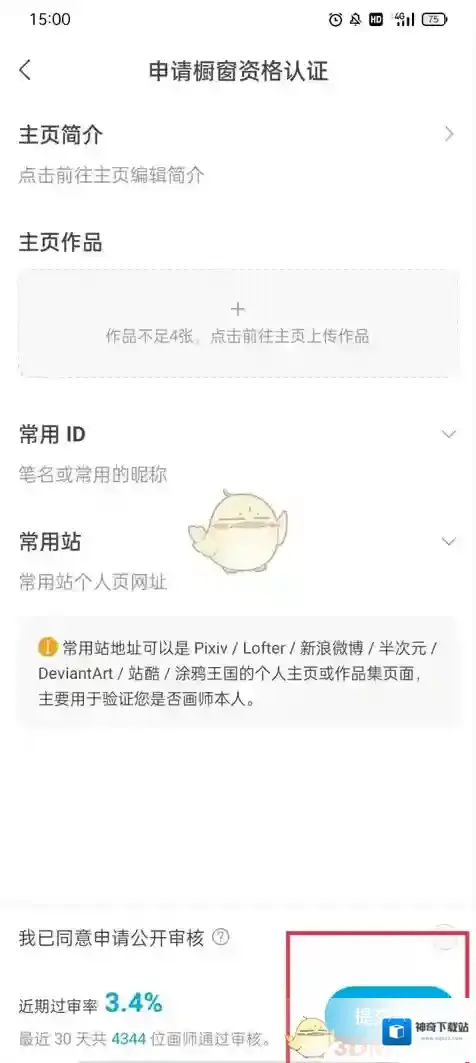 2、阅读完画师认证须知之后,勾选“我已阅读并同意以上规定”,开始申请画师认证。