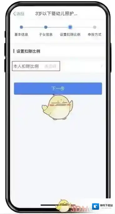 5、等到设置好本人的扣除比例,纳税人根据实际情况选择100%(全额扣除)或50%(平均扣除)两种本人扣除比例。选择完成后,点击下一步。