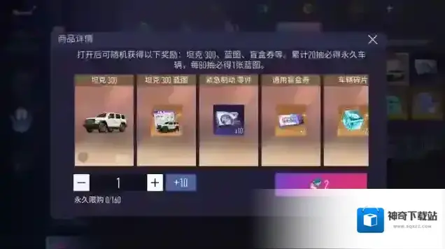 『坦克 300专属秘宝』将于6月16日上架特惠秘宝,打开后可随机获得以下奖励:坦克 300、蓝图、盲盒券等。累计20抽必得永久车辆,每80抽必得1张蓝图。