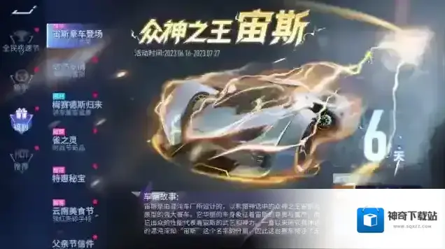 『在线抽豪车』全民极速节,在线抽豪车!6月17日~6月24日,活动期间每日在线即可获得“豪车通用签约券”,累计在线一定时长还可以获得“宙斯幸运券”。获得宙斯幸运券的车手,可以在6月22日~6月24日 期间参与抽奖,有机会获得永久豪车“宙斯”。