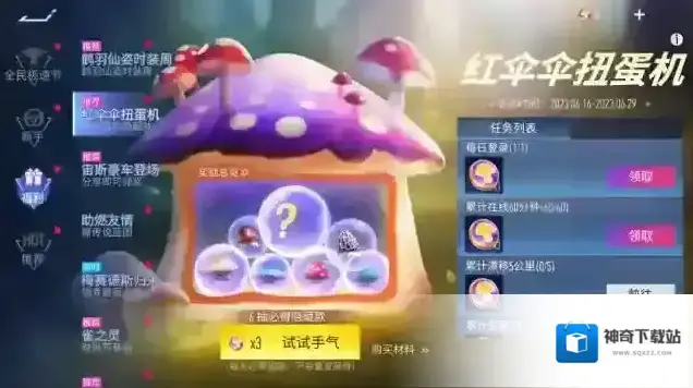 红伞伞白杆杆,扭蛋机里有惊喜!6月16日-6月29日,红伞伞扭蛋机惊喜来袭!完成对应任务领取扭蛋币即可参与抽奖,多款趣味伞伞头套等你来拿。听说还有特殊隐藏款头套等待有缘人来揭晓!活动期间,消耗3个扭蛋币可参与一次抽奖,奖池中已获得的奖励不会重复获得;如果在抽奖过程中提前抽中隐藏款奖励,则剩余未获得的全部奖励可一次性免费获得!