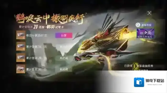 『登录送20抽+盲盒车抢先试驾』下载新版本内容,完成登录、分享任务即可获得鹤羽盲盒券20张+八级鹤羽试驾卡。盲盒神车,抢先试驾,不容错过!