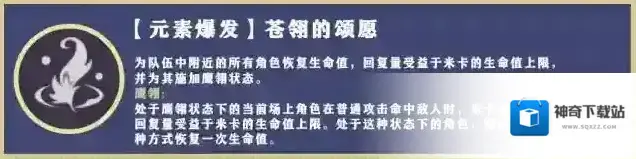 米卡自己的苍翎的颂愿的鹰翎状态为队伍中的角色进行治疗时,将为米卡恢复3点元素能量。通过一次施放苍翎的颂愿产生的鹰翎状态,至多恢复5次元素能量。