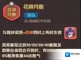 羁绊技能:和羁绊武将同时上阵时才会生效,且羁绊效果随着羁绊武将的星级数提升而提升。羁绊技能的效果可以发挥羁绊武将的长处或弥补其短板,就拿貂蝉来说,虽然被称为回怒型武将,但她却无法为自己回复怒气,而这次战魂技能就可以有效解决貂蝉的“自充能”问题。