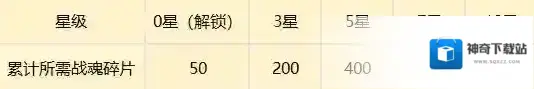 战魂升星:利用战魂碎片进行升星,可以提升战魂带来的属性收益和战魂的主战技能效果。下表是将战魂升到对应星级所需的战魂碎片详情。