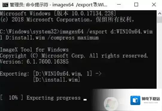 7、在命令提示符模式下,输入命令imagex64 /export d:WIN10x64.wim 1 d:install.wim /compress maximum。注意,这个命令小编要特别说一下,imagex64或者imagex都可以,这是32/64位命令符工具的选择问题。然后就是d:WIN10x64.wim,盘符是之前提取*.wim后的位置,WIN10x64.wim就是修改命名后被即将被提取的对象,d:install.wim则是合成后的镜像名称,不要搞错。这个命令合并起来解释就是,把保存在D盘的WIN10x64.wim中卷号为1的系统添加到新的install.wim文件中。如果有多个需要提取合成到新*.wim中就继续输入,区别就是卷号了(1那里),如下图所示: