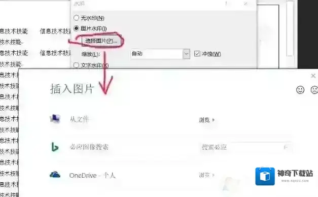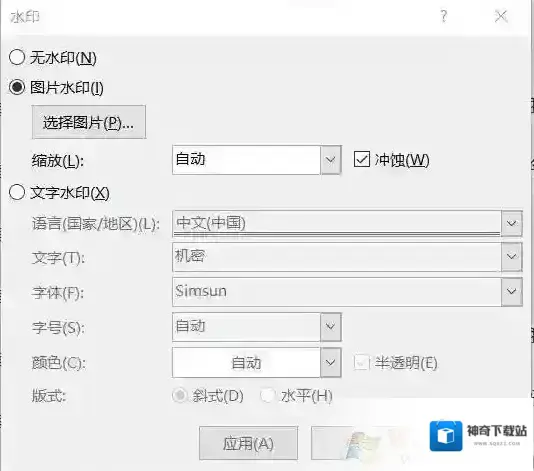 4、水印不仅仅可以添加文字,图片也可以添加,常用于添加公司Logo等标志性的图片以达到宣传的效果。点击“图片水印”前面的小圆圈进入图片水印编辑状态,点击“选择图片”找到你的图片,点击确定即可添加图片水印。