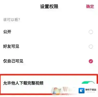 5、将下方“允许他人下载完整视频”选项关闭,点击确定之后别人就没法下载你上传的视频了。
