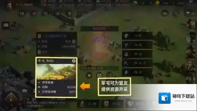 司仓每天可设置1次军屯,军屯不仅自己可以开采,还能让5-7个盟友开采。因开荒期不少城建需要额外的石头,建议前两天找盟友的高级石头地进行开采。注意这个开采行军没有行军加速,可能路程较长,建议使用二队(不带兵)去采即可。④军演