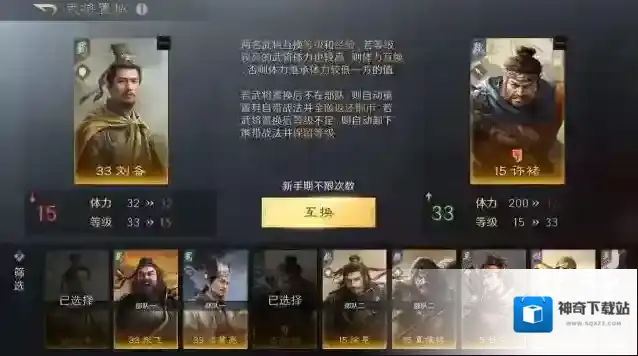置换武将等级中有个非常重要的点,一定要记住!那就是如果在二队满体力,但一队未满体力的情况下,需要二队的武将置换给一队的时候,千万不要直接置换!这种情况下,如果主公使用二队和一队武将直接置换,会让二队武将的体力与一队的武将体力相同(即两支队伍均取体力最低的值)!会出现体力损失,同时二队就不能自动进入练兵所升级了,因为练兵所的要求是队伍里的所有武将体力均满!