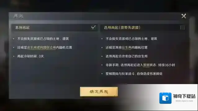 选州再起在新手期,只限于当前落地没有落到自己备战盟所在州的情况,可跨州再起到盟所在的州。本州再起则适合发育能力较强,但是落地位置不好的玩家。如果主公在开荒期的某个时间点,附近找不到高级地可打,或者你的四周都是发育能力较强的玩家,这时候可以果断选择本州再起。因为一般第二或三天,盟里就会开启打城计划了,后续就需要我们迁到同盟已攻占的城池位置了,且本州再起与迁城两者互不影响。一般在盟里没有城池时,本州再起功能会把主公再起到一个人员较为稀少的地方,如果盟里已开始打城的话,本州再起大概率会把主公再起到盟里城池附近位置。所以本州再起在开荒期不需要留CD,大胆使用即可。八、第一天可额外获取资源方式①屯田