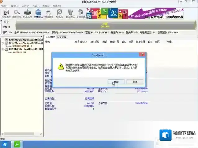 7、在弹出的提示窗口中选择“确定”。注:一般GUI分区表格式支持超过2TB以上的硬盘分区,而MBR分区表类型只支持2TB以下的硬盘。