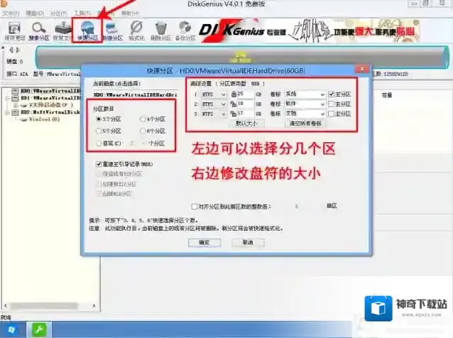 8、转换MBR成功后,选择快速分区,根据要求创建自己的分区。选择完成后,点击确定开始分区,如下图所示: