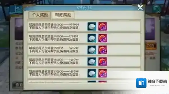 活动结束后,根据帮会中所有玩家上传的各种帮会物资总量,可以计算出帮会在本次活动中共获得了多少点资源积分,帮会获得的资源积分将会影响帮会成员在接下来的一周时间内,可以使用帮贡额外兑换的道具种类以及每个人可以兑换的数量上限,资源积分越高,可以额外兑换的道具种类和数量限制也就越多。可用帮贡兑换的道具:日元精华、归元灵玉。