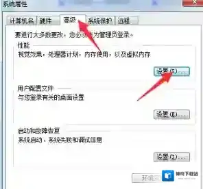 4、进入系统属性界面点击左上角菜单栏的高级系统设置选项;选择高级标签,然后点击性能栏后方的设置选项。