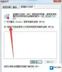 5、进入性能选项对话框,点击上方菜单处的数据执行保护,然后再为除下列选定程序之外的所有程序和服务启用 DEP勾选,