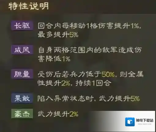 胆量 受伤后若兵力低于50%,则全属性提升2%,持续1回合