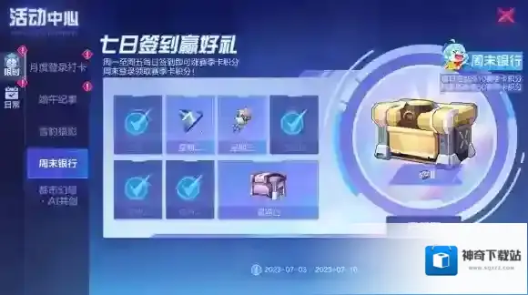 全新每周登录打卡活动“周末银行”即将于7月3日上线,每日打卡领即可取常规签到奖励,同时每次存入赛季卡积分奖励至“周末银行”,周末最高能领取50赛季卡积分!