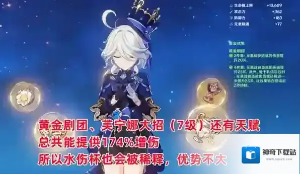 造成这种现象的原因是芙宁娜的增伤效果非常多:黄金剧团有70%的战技增伤;7级大招每层气氛值转化增伤比例为0.19%,二命气氛值上限为400且很容易叠满,相当于76%增伤;还有天赋的28%增伤。这些全加起来就有174%了,水伤杯的46.6%自然容易被稀释,因此相对于同样溢出的生命杯也就没太多优势了。