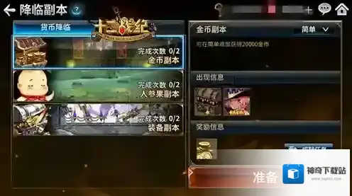 不同的地方在于,降临副本之中又分成货币降临和英雄降临,货币降临中又分成金币副本、人参果副本、装备副本三个副本,奖励分别为金币、人参果和装备,每个货币降临副本每天可以进入两次。