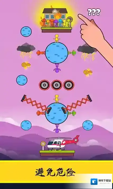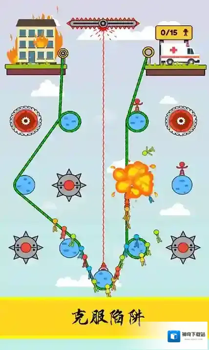 2、在拉绳过程中,玩家需让小人躲避齿轮、火焰、爆炸等危险陷阱,确保小人安全。