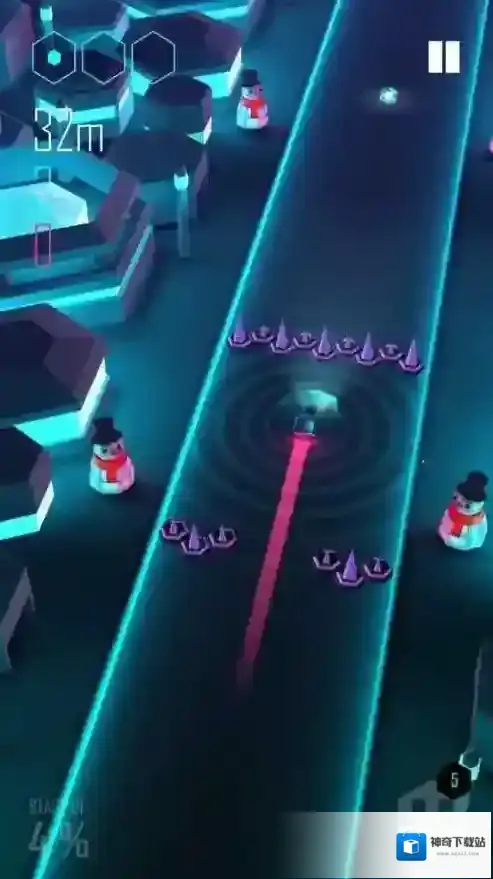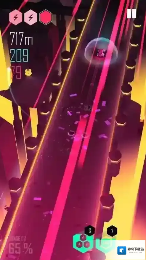 2、视觉特效盛宴:发光盒子碰撞方块时触发粒子爆炸效果,赛道场景随音乐风格切换霓虹、极光等主题,带来强烈视觉冲击。