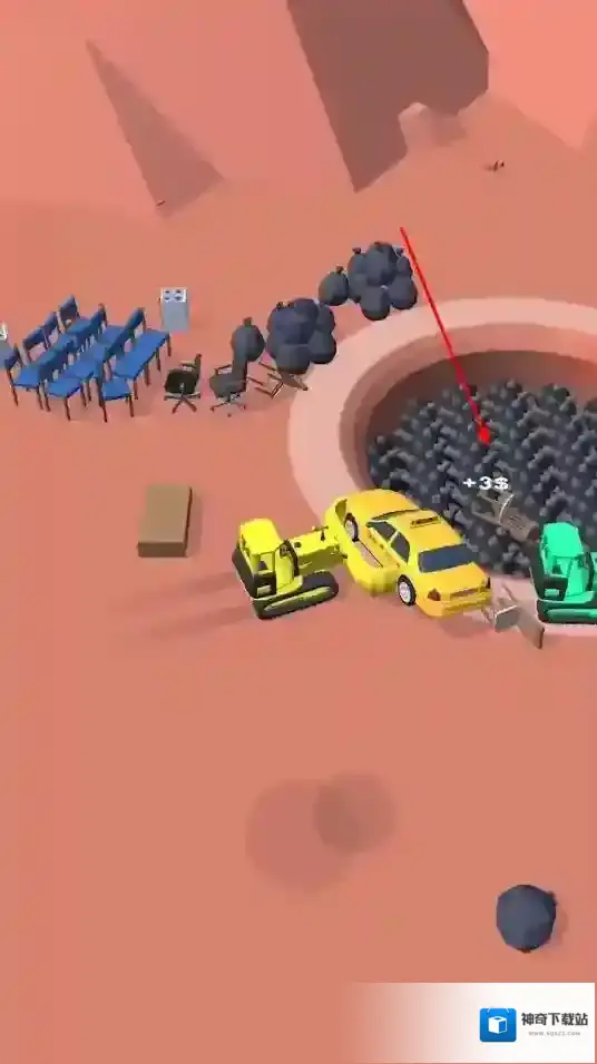 1、玩家操控推土机等机械,将场景中的物品推到大坑处,成功处理可获得金币奖励。