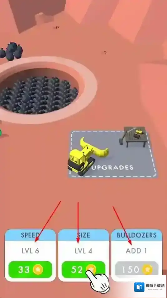 2、使用收集到的金币对推土机进行升级,可提升速度、大小等属性,还能增加推土机数量。