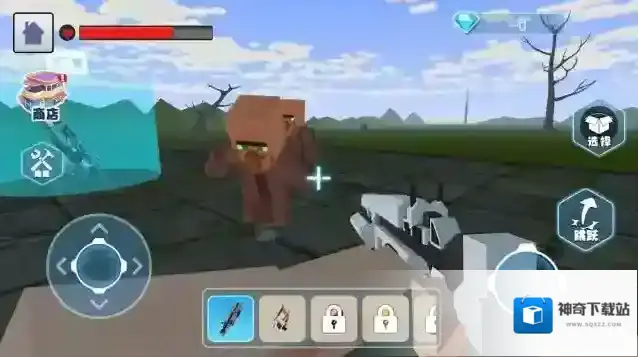 2、看到箭头指向的道具(武器箱),移动角色靠近,自动拾取新武器,切换使用,提升战斗能力。